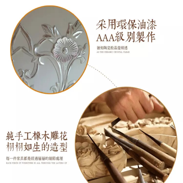 橡木雕刻本色豪華餐桌修光:運用精雕細刻及薄刀法修去細餐椅坯中的刀痕鑿垢,使作品表面細致完美。要求刀跡清楚細密,或圓滑、或板直、或粗獷,力求把作 品意圖準確地表現出來;